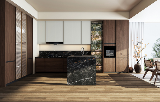 在厨柜设计中,地柜是采用抽拉方式,而吊柜采用的是平开方式,从设计美学来说,地柜是横线条,吊柜是竖线条,归纳为“地横吊竖